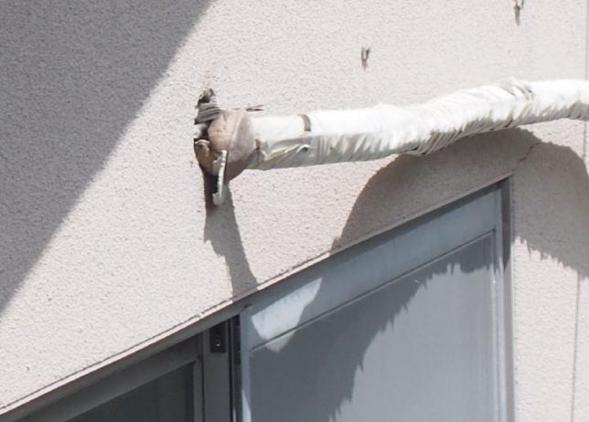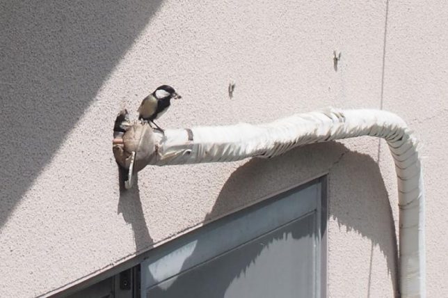 エアコンのパイプと壁の隙間から小鳥が出入りしています。ひなの鳴き声のようなも声が聞こえるので中に巣を作ったのではないかと思います。